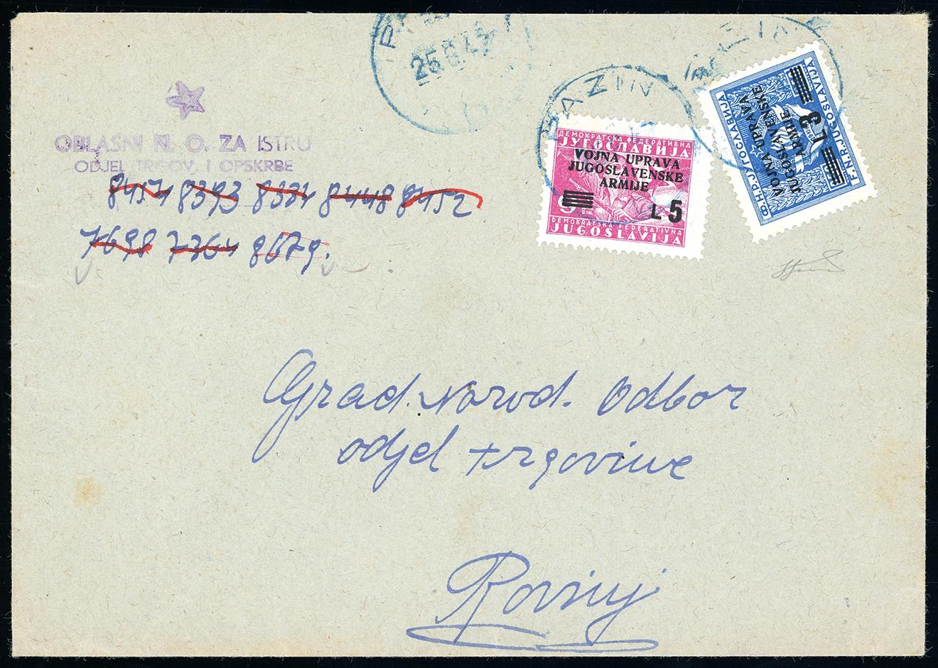 LITORALE SLOVENO AMMINISTRAZIONE MILITARE JUGOSLAVA 1947 - 3 lire su 50 d., 5 lire su 9 d. (70,71), perfetti, su busta da Pisino 25/6/1947 a Rovigno. Non comune. Ferrario.