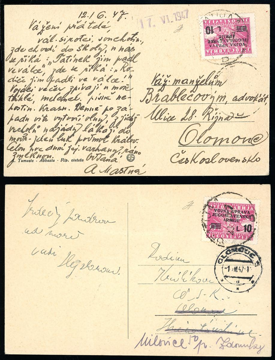 LITORALE SLOVENO AMMINISTRAZIONE MILITARE JUGOSLAVA 1947 - 10 lire su 9 d. (73), due esemplari, perfetti, su altrettante cartoline da Abbazia per la Repubblica Cecoslovacca. Non comuni. Ferrario.