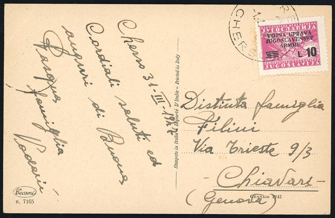 LITORALE SLOVENO AMMINISTRAZIONE MILITARE JUGOSLAVA 1947 - 10 lire su 9 d. (73), perfetto, su cartolina da Cherso 1/4/1947 a Chiavari.