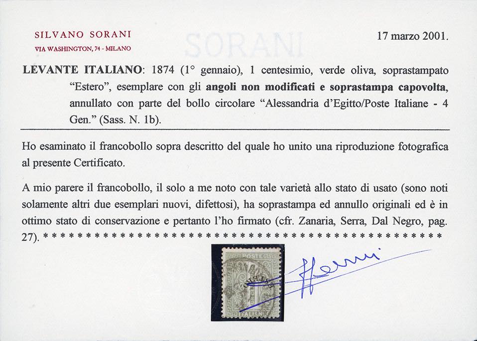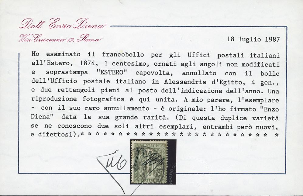 EMISSIONI GENERALI 1874 - 1 cent. De La Rue, tutti e quattro gli angoli non modificati, soprastampa capovolta "ESTERO" (1b), perfetto, usato ad Alessandria d'Egitto 4/1. Si tratta dell'UNICO ESEMPLARE USATO di questa rarissima varietà, di cui si conoscono tre soli esemplari nuovi (due difettosi). UNO DEI FRANCOBOLLI PIU' IMPORTANTI DI TUTTO IL LEVANTE ITALIANO. Emilio Diena, cert. Enzo Diena e Sorani.