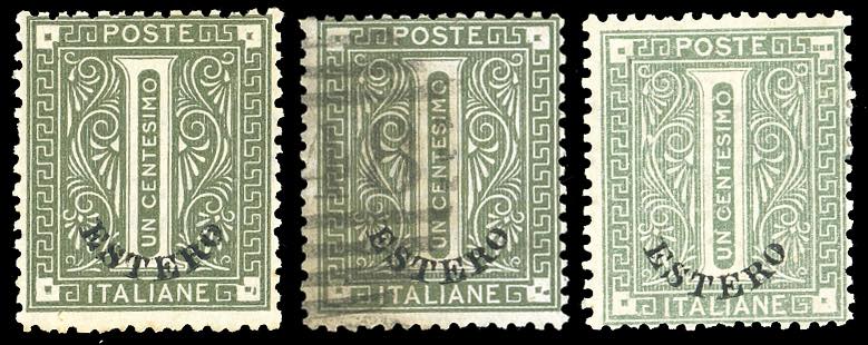 EMISSIONI GENERALI 1874 - 1 cent. De La Rue, due punti nell'angolo inferiore destri (1c), un esemplare nuovo, gomma originale, ed uno usato; 1 cent. De La Rue, tre punti nell'angolo superiore destro (1d), esemplare nuovo, gomma originale.