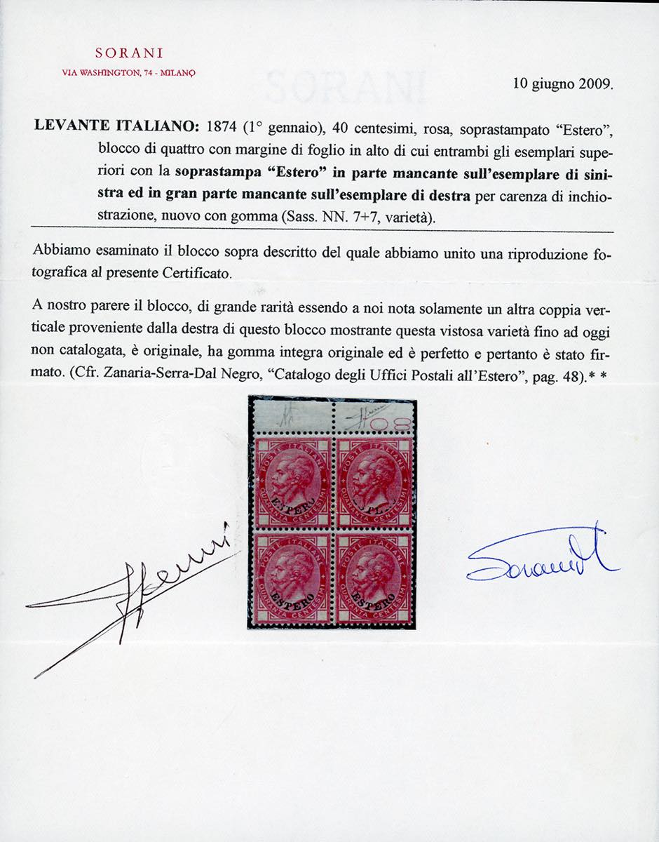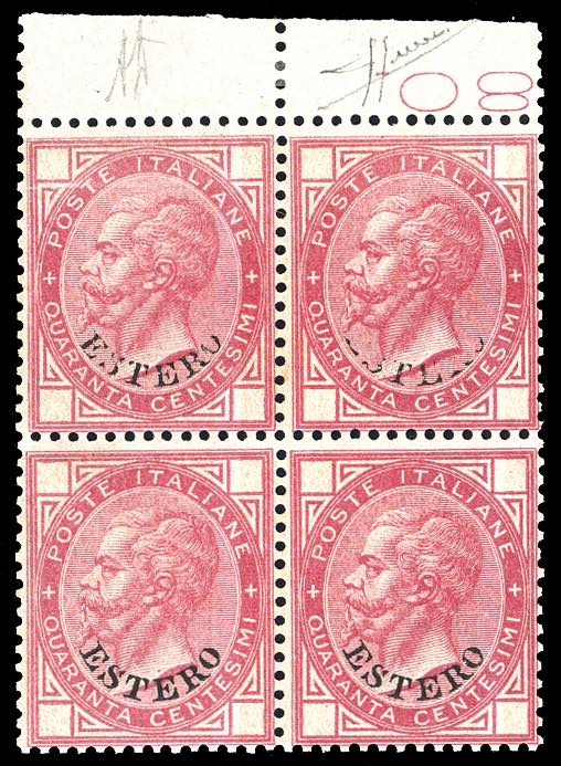 EMISSIONI GENERALI 1874 - 40 cent. De La Rue, blocco di quatro, i due esemplari superiori con soprastampa "ESTERO" parzialmente mancante (7b), bordo di foglio, gomma originale integra, perfetto e di ottima qualità. Oltre a questo blocco si conosce una sola altra coppia verticale mostrante questa varietà. INSIEME UNICO. G.Bolaffi, cert. Sorani.