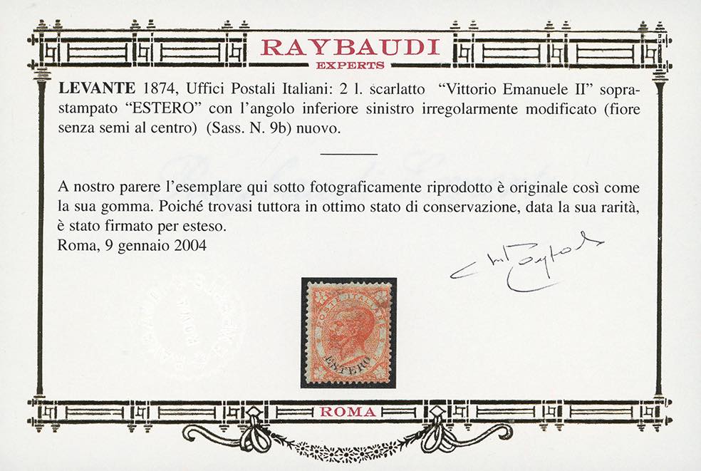 EMISSIONI GENERALI 1874 - 2 lire De La Rue, soprastampato "ESTERO", fiore inferiore sinistro senza semi al centro (9b), nuovo, gomma originale, perfetto. Raro. Sorani, cert. Oro Raybaudi.