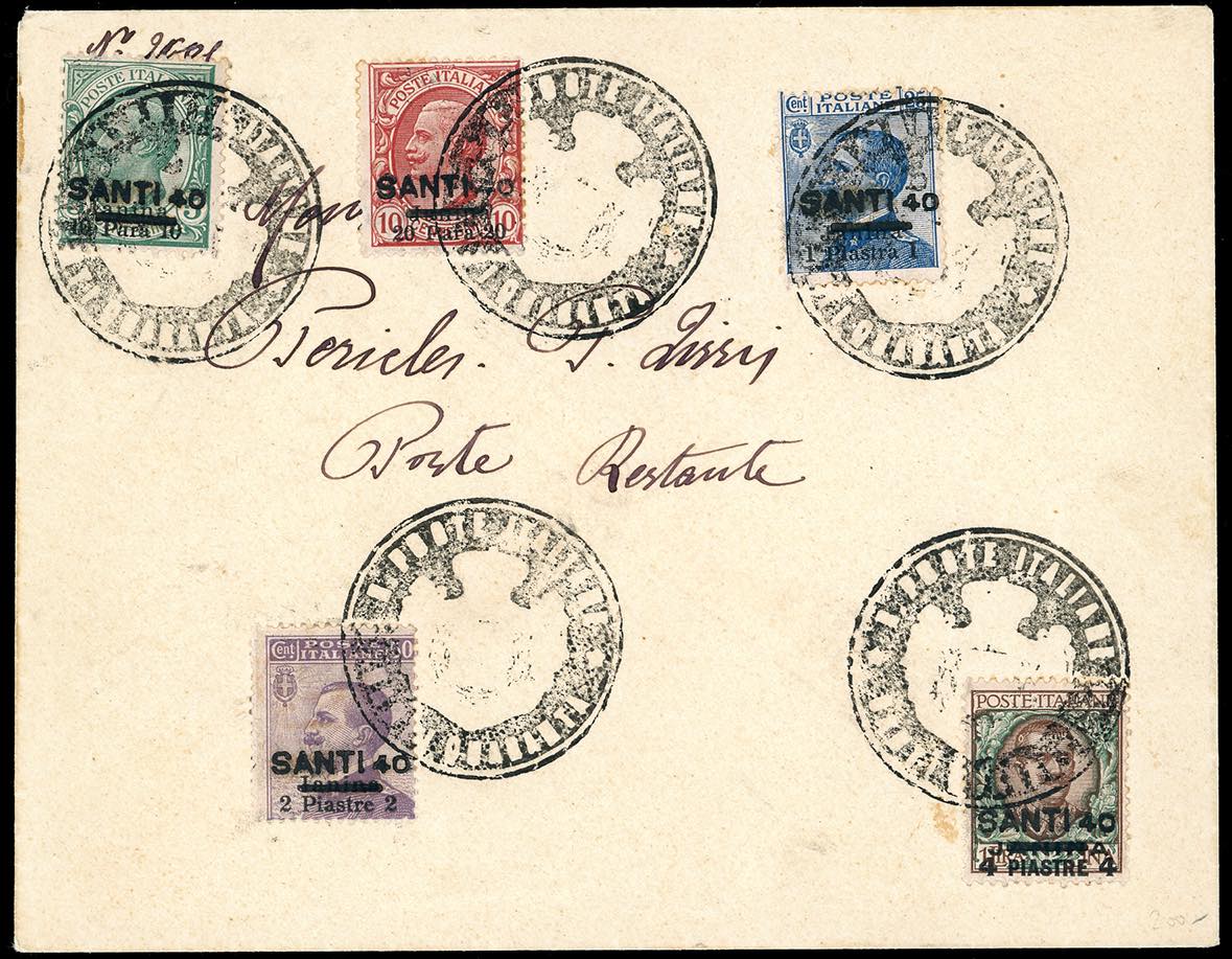 ALBANIA UFFICIO POSTALE ITALIANO 1914 - 10 pa., 20 pa., 1 pi., 2 pi., 4 pi. (Giannina 1/2,4/6), con soprastampa semiufficiale "SANTI 40", perfetti, annullati su busta non viaggiata con lo speciale bollo in negativo.