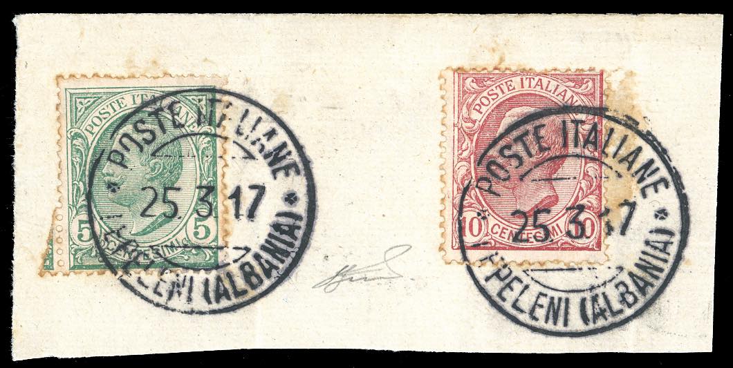 ALBANIA UFFICIO POSTALE ITALIANO 1917 - 5 cent. e 10 cent. Leoni (Regno 81/82), perfetti, usati su frammento a Tepeleni il 25/3/1917. Annullo molto raro. Ferrario.