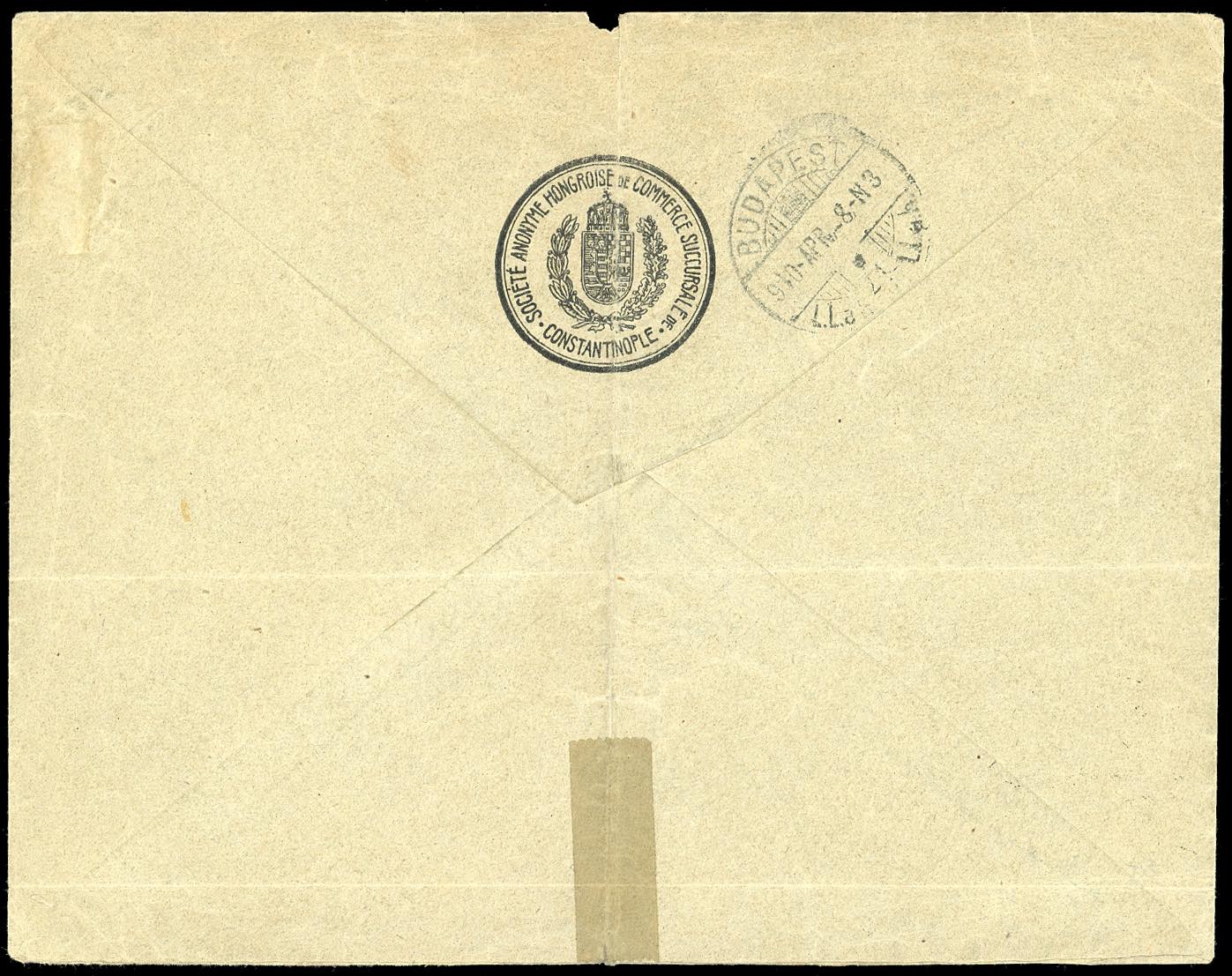 COSTANTINOPOLI 1910 - 20 piastre su 5 lire azzurro e rosa (26), perfetto, isolato su raccomandata da Costantinopoli 6/4/1910 per l'Ungheria. Molto raro l'uso isolato! Ferrario.