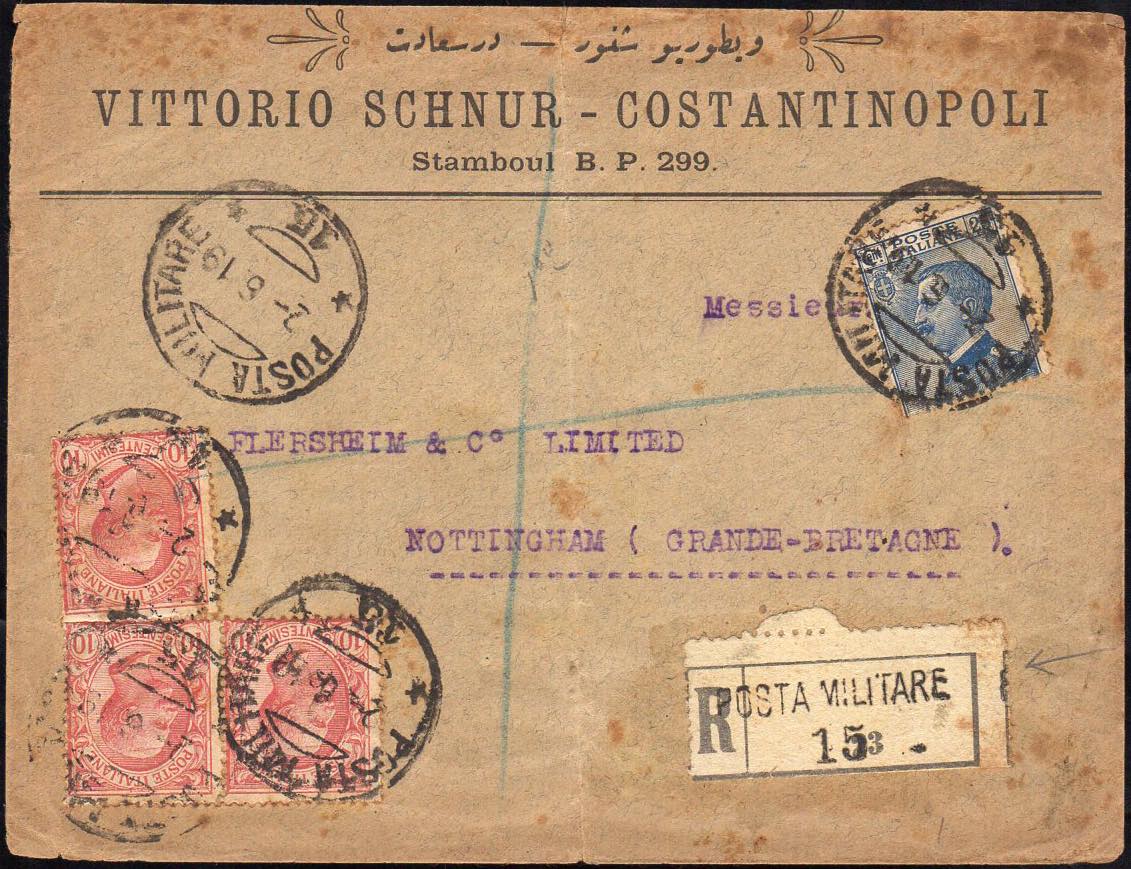 COSTANTINOPOLI 1919 - 10 cent. Leoni, tre esemplari, 25 cent. Michetti (Regno 82,83), otttimo stato, su busta raccomandata dalla Posta Militare n. 15 2/6/1919 per la Gran Bretagna. Non comune!