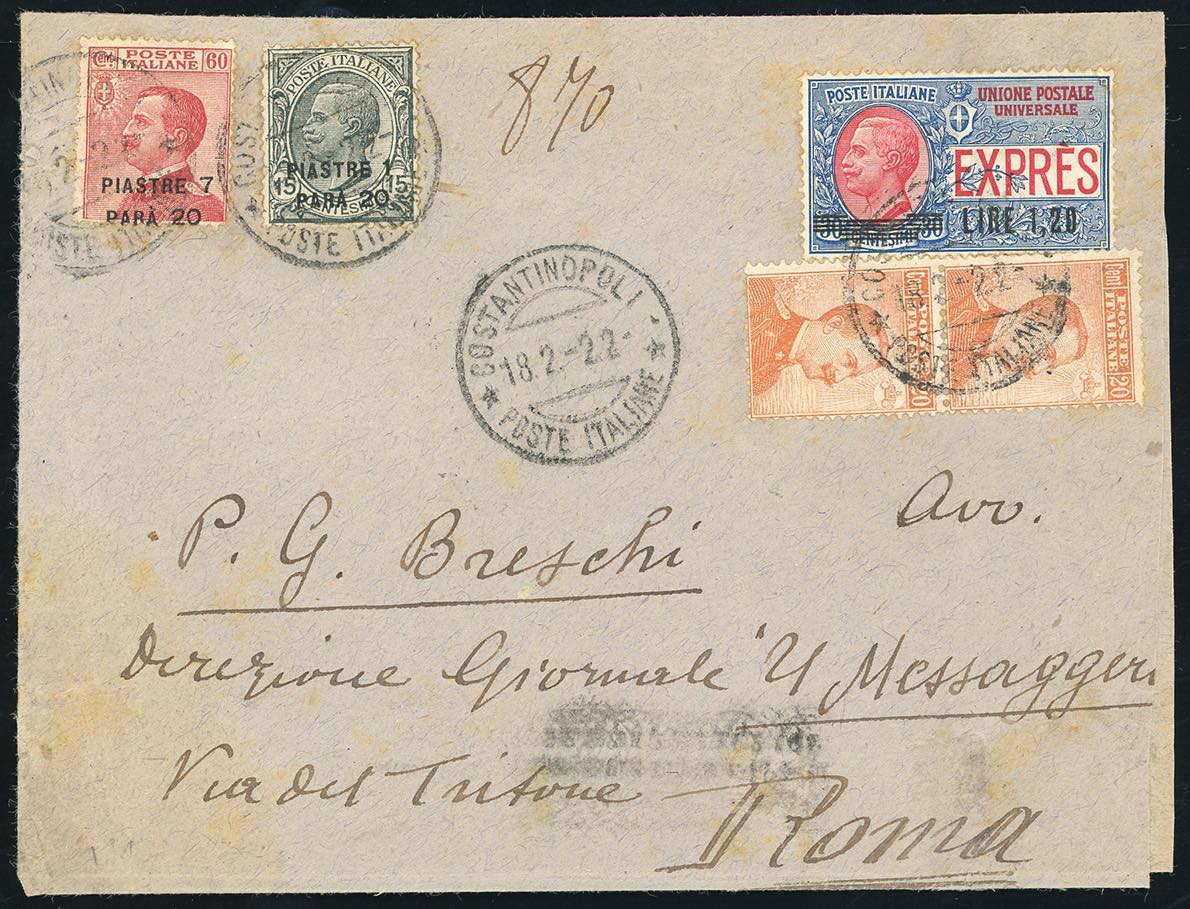 COSTANTINOPOLI 1922 - 1,20 pi. su 15 cent., 7,20 pi. su 60 cent. (36/39), perfetti in affrancatura mista con 20 cent. Michetti, coppia, e 1,20lire espresso soprastampato (Regno 109,E5), su busta da Costantinopoli 18/2/1922 a Roma. Interessante!