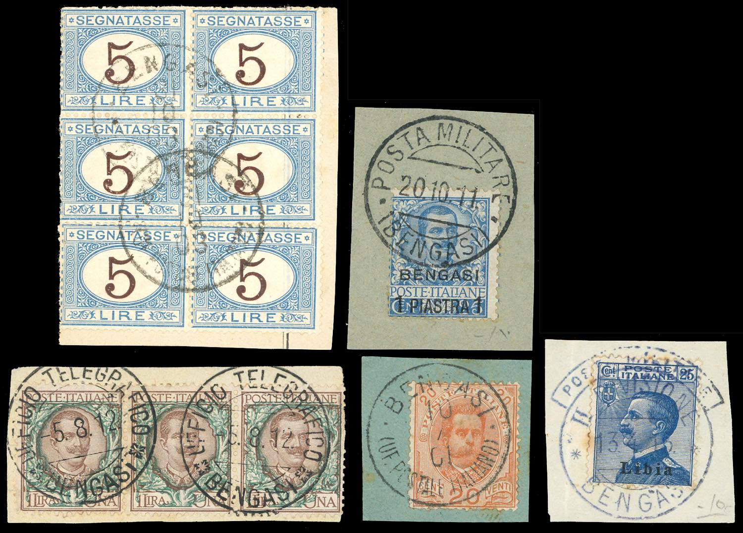 BENGASI 1901/1916 - Cinque frammenti con francobolli di Regno, Bengasi e Libia, tutti con differenti annulli di Bengasi. Interessante.