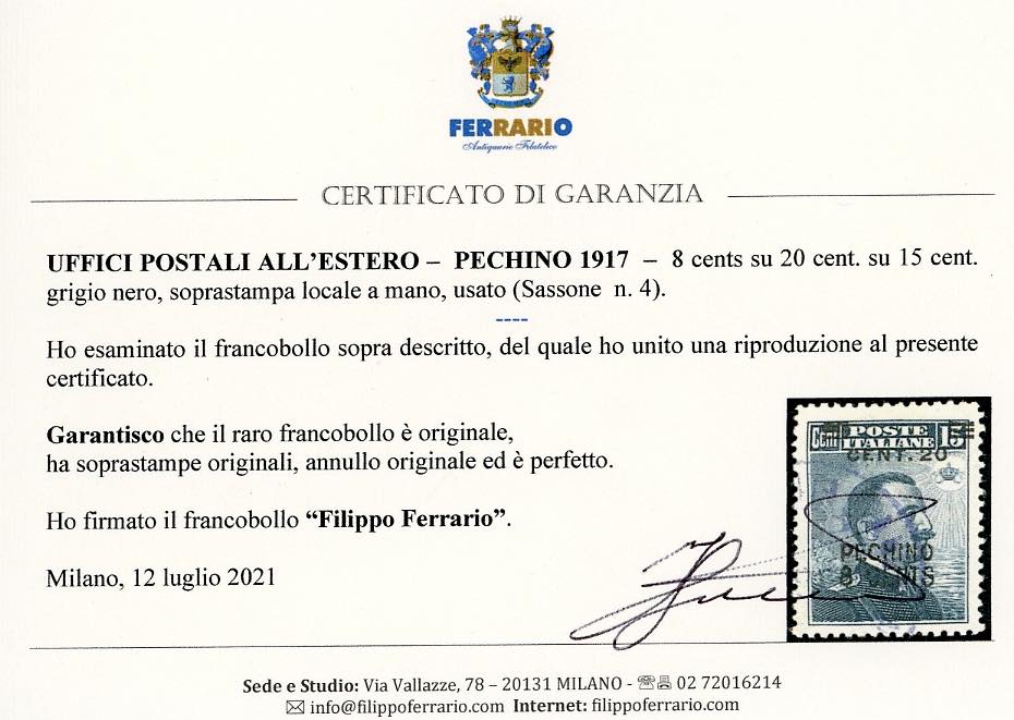 Lotto 3370 - PECHINO 1917 - 8 cent. su 20 cent. su 15 cent. (4), usato, ...