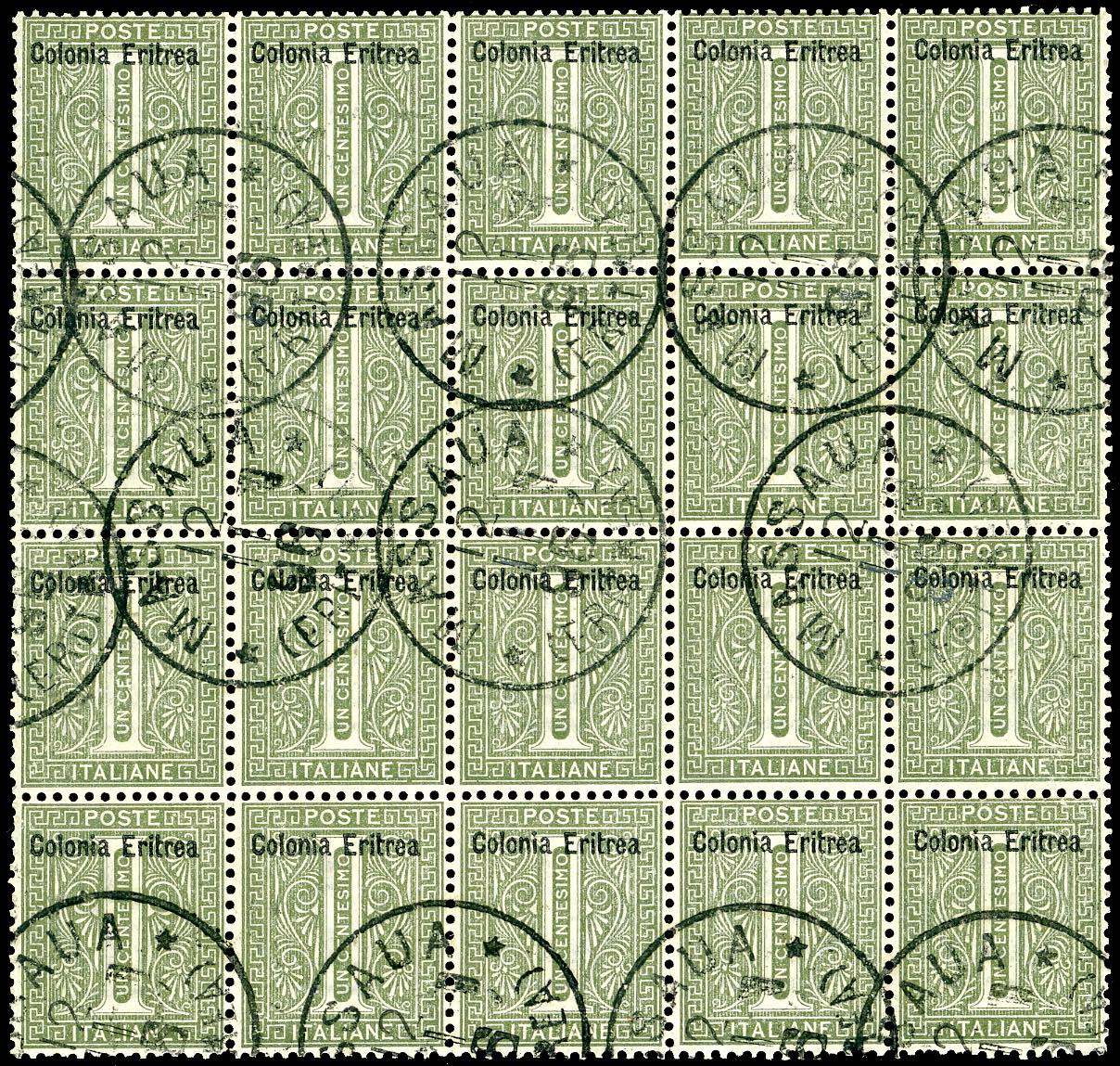1893 - 1 cent. De La Rue soprastampato (1), eccezionale blocco di 20 usato a Massaua, perfetto. Probabilmente il massimo blocco noto usato. ... Leggi tutto