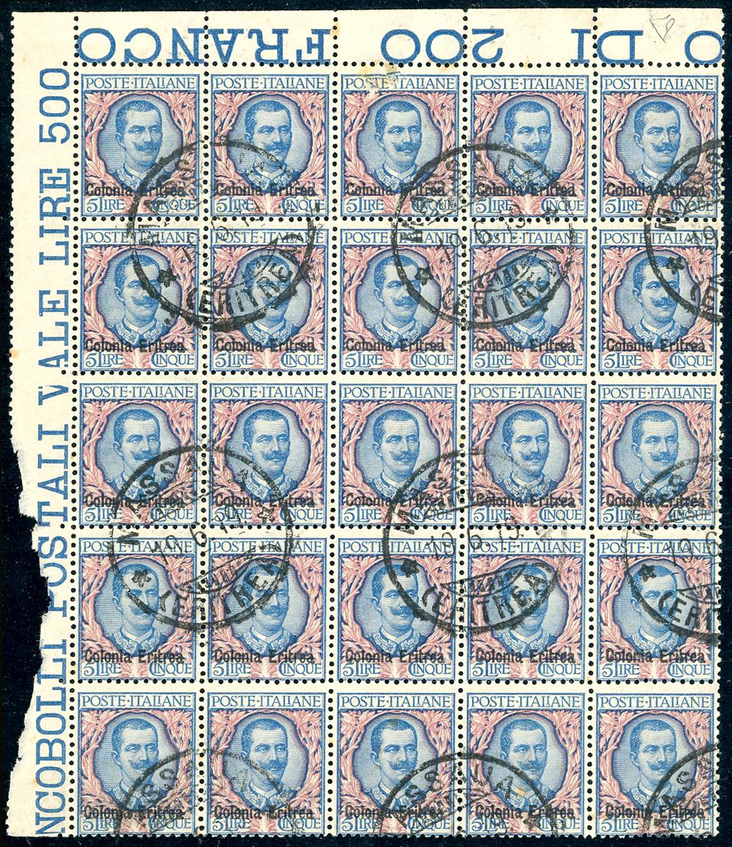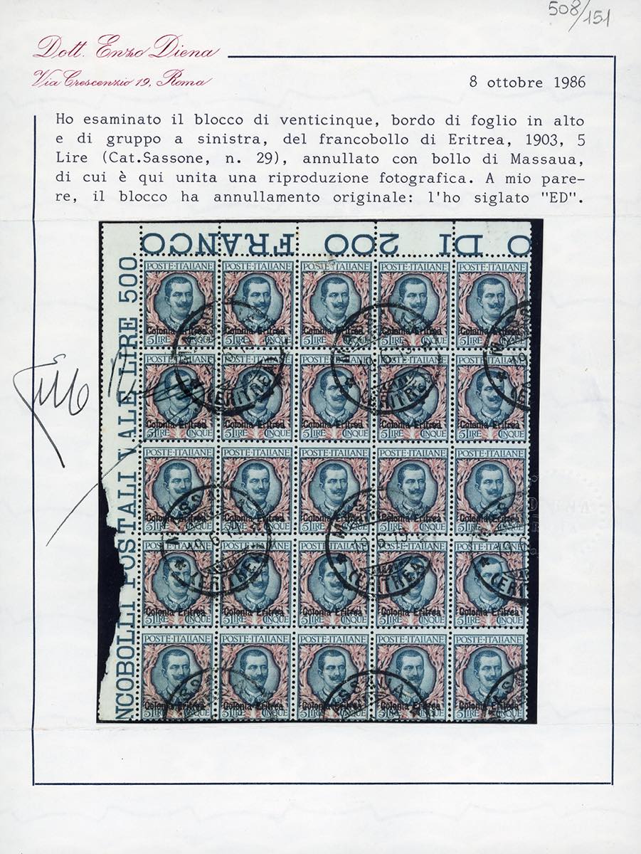 1903 - 5 lire Floreale soprastampato (29), blocco di venticinque esemplari usati a Massaua, perfetto. Rarissimo, si tratta del massimo blocco noto usato! Cert. Diena.
