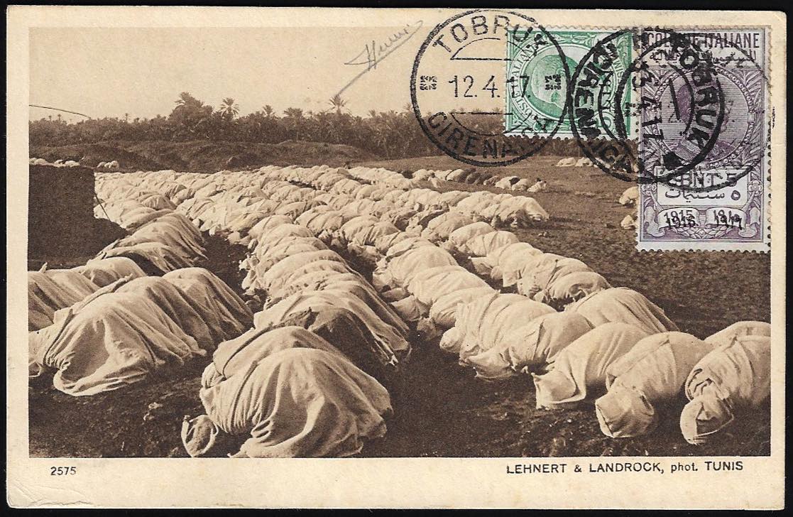 1917 - 5 cent. Leoni soprastampato (3), in affrancatura mista con 5 cent. marca da bollo delle Colonie soprastampata, perfetti, su cartolina da Tobruk 12/4/1917 a Torino. Rara affrancatura mista di valori gemelli. Sorani.