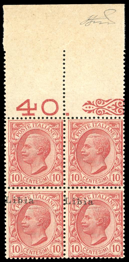 1912 - 10 cent. soprastampato (4), blocco di quattro, i due esemplari superiori senza soprastampa, i due inferiori con soprastampa fortemente spostata in alto e a sinistra, bordo di foglio, gomma originale integra, perfetto. Varietà non catalogata. Ferrario.