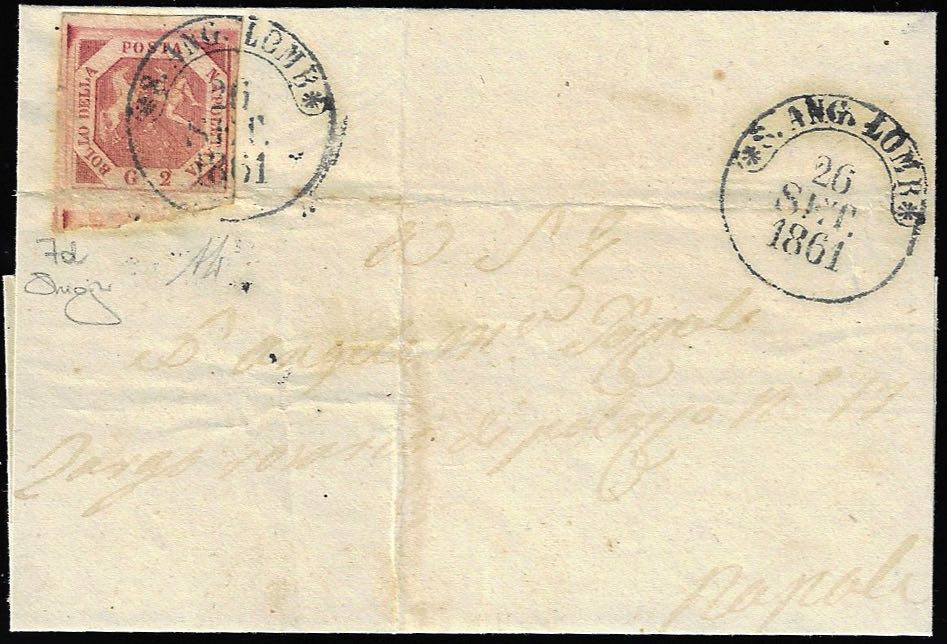 S.ANGELO DEI LOMBARDI, cerchio punti 13 - 2 grana (7d), lieve piega orizzontale in basso, che lascia il francobollo perfetto, su sovracoperta di lettera del 26/9/1861 per Napoli. Cert. Oro Raybaudi.