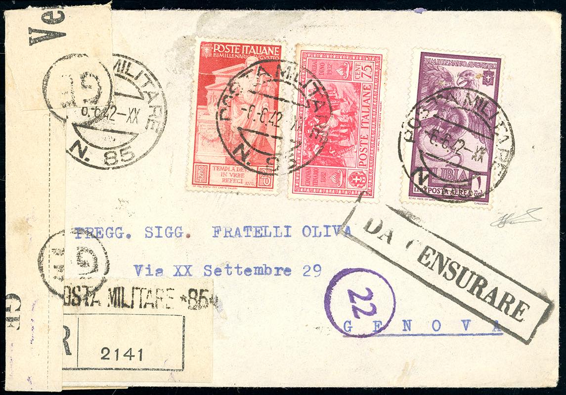 POSTA AEREA 1942 - 1 lira Augusto (37), in affrancatura mista con 20 cent. Augusto e 75 cent. Garibaldi di Regno (418,320), perfetti, su busta raccomandata dalla Posta Militare 85 6/6/1942 a Genova, verificata per censura. Interessante. Ferrario.