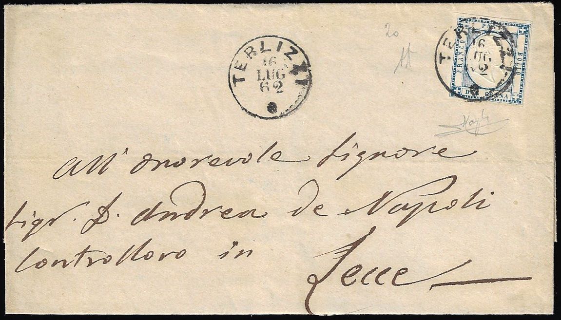 TERLIZZI, cerchio piccolo punti 6 - 2 grana (20), perfetto, su sovracoperta di lettera del 16/7/1862 per Lecce. Bella! A.Diena, Raybaudi.