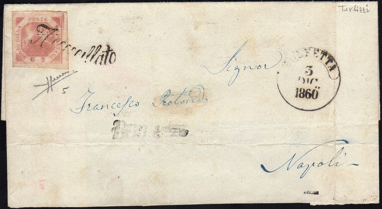 TERLIZZI, lineare + svolazzo e cerchio di Molfetta punti 13 - 2 grana (5), perfetto, su sovracoperta di lettera del 3/12/1860 per Napoli. Rara lettera in periodo di Luogotenenza di Carlo Farini. Cert. Sorani.