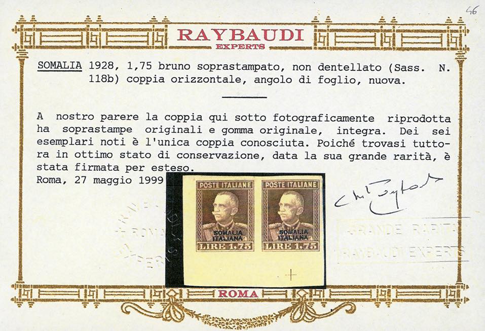 1928 - 1,75 lire bruno Vittorio Emanuele III, non dentellato (118b), angolo di foglio, gomma originale integra, perfetto. IL PIU' BELLO DEI SOLI SEI ESEMPLARI NOTI. Cert. A.Diena e fotocopia cert. Oro Raybaudi della coppia di provenienza.