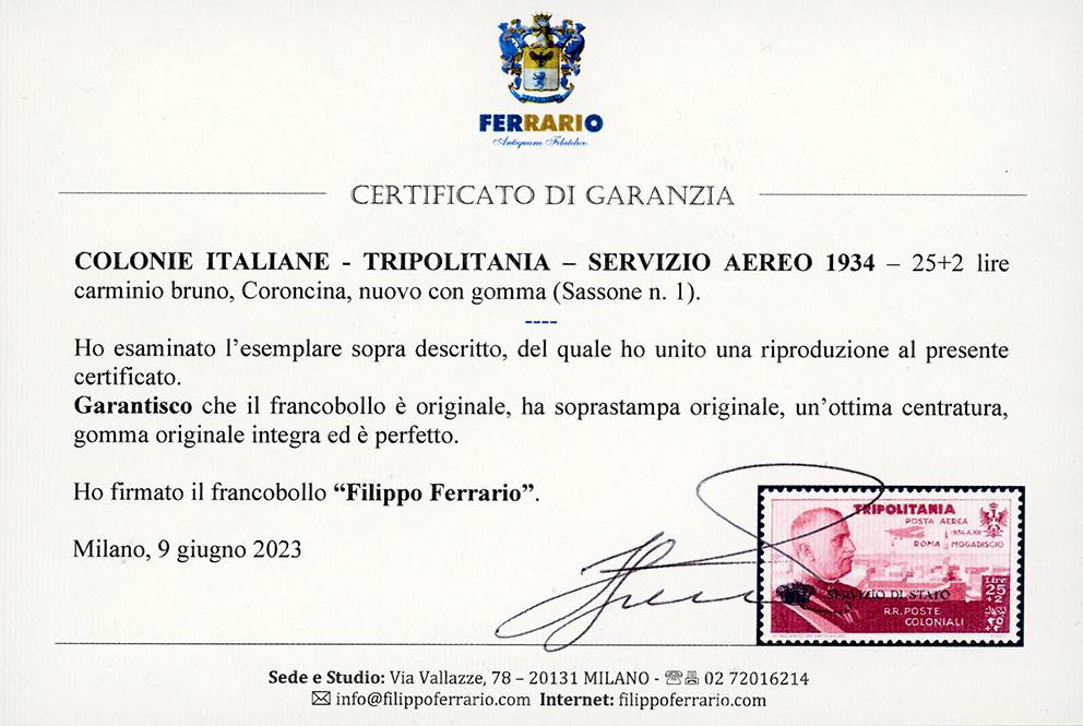 SERVIZIO AEREO 1934 - 25 + 2 lire Coroncina (1), nuovo, gomma originale integra, perfetto. Splendido per freschezza e centratura. G.Bolaffi, cert. Ferrario.