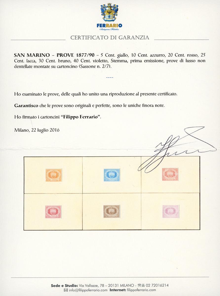1877/90 - 5 cent., 10 cent., 20 cent., 25 cent., 30 cent., 40 cent. Stemma (2/7), prove di lusso non dentellate montate su cartoncino. Insieme unico ed irripetibile, rarità del settore. Ex. Collezione dell'Avvocato. Cert. Ferrario.