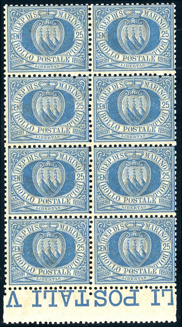 1894 - 25 cent. Stemma (30), blocco di otto, discreta centratura, bordo di foglio, gomma integra, perfetto.