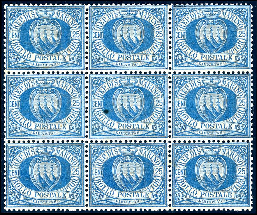 1899 - 25 cent, azzurro Stemma (30), ottima centratura, blocco di nove, gomma originale integra, perfetto. Ottima qualità. Ferrario.