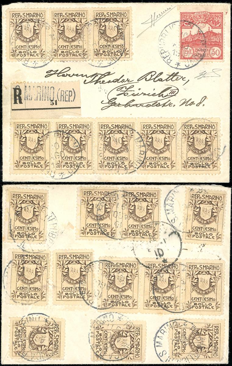 1911 - 1 cent. Stemma, fondo giallo, venti esemplari, 30 cent. Veduta (49,39), ottimo stato, in affrancatura fronte/recto su busta raccomandata da San Marino 10/8/1911 a Zurigo. Rarissima, la massima affrancatura nota di questo francobollo. Ferrario, cert. Sorani.