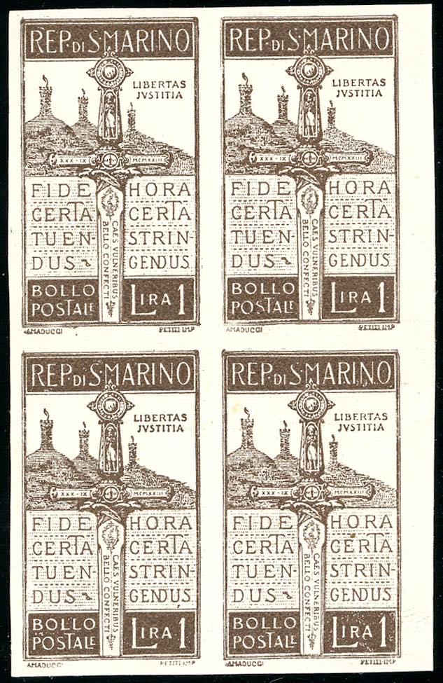 1923 - 1 lira Pro Volontari, prova d'archivio in bruno su carta sottile (P97), non dentellata, blocco di quattro, bordo di foglio, senza gomma come sempre. Bello. Ferrario.