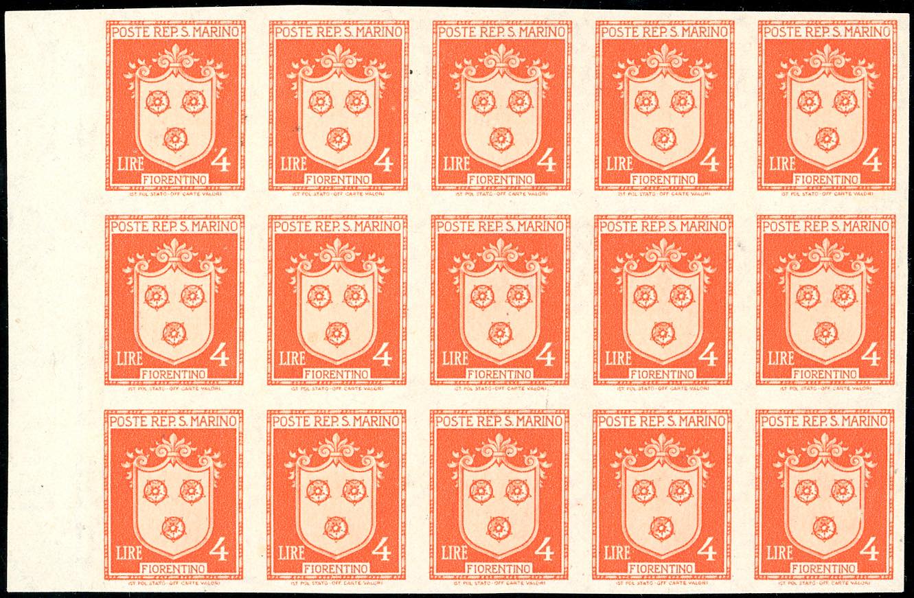 1945 - 4 lire Stemmi, non dentellato (288a), blocco di 15, bordo di foglio, gomma originale integra, perfetto. Bello. Ferrario.