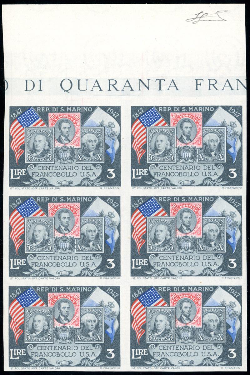 1947 - 3 lire Centenario francobollo Stati Uniti, non dentellato (331b), blocco di sei, bordo di foglio, gomma integra, perfetto. Bello. Ferrario.