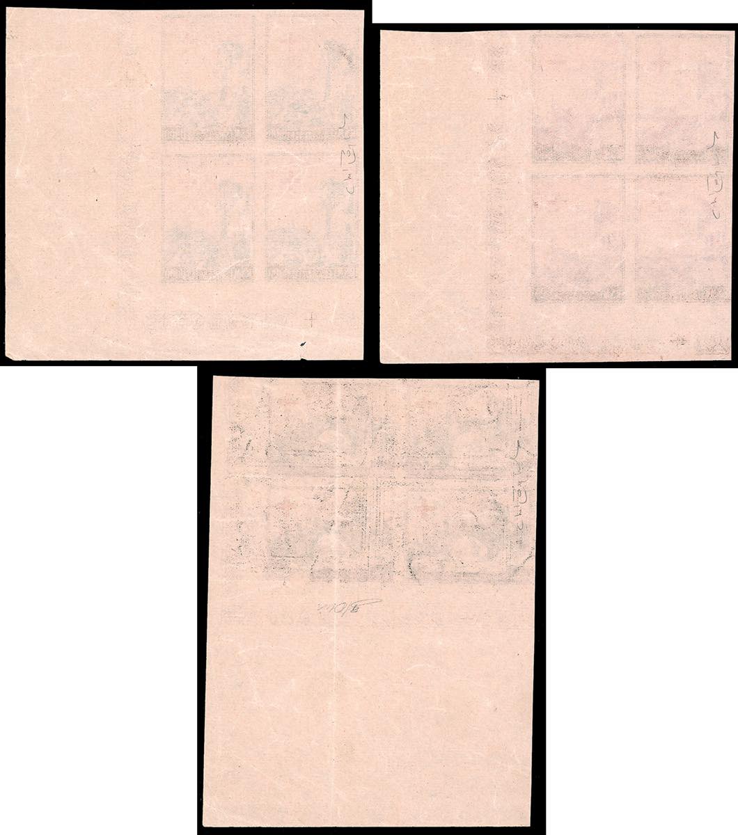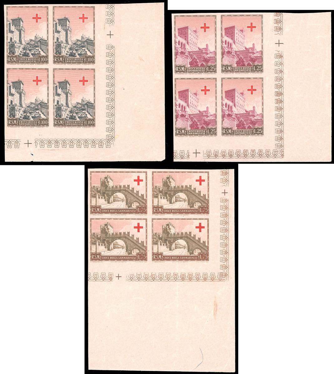 1951 - Croce Rossa, serie completa (369/371), prove di macchina su carta sottile rosa, senza filigrana, non dentellata e senza gomma, blocchi di quattro, angolo di foglio, perfetti. Rari! Cert. Raybaudi.
