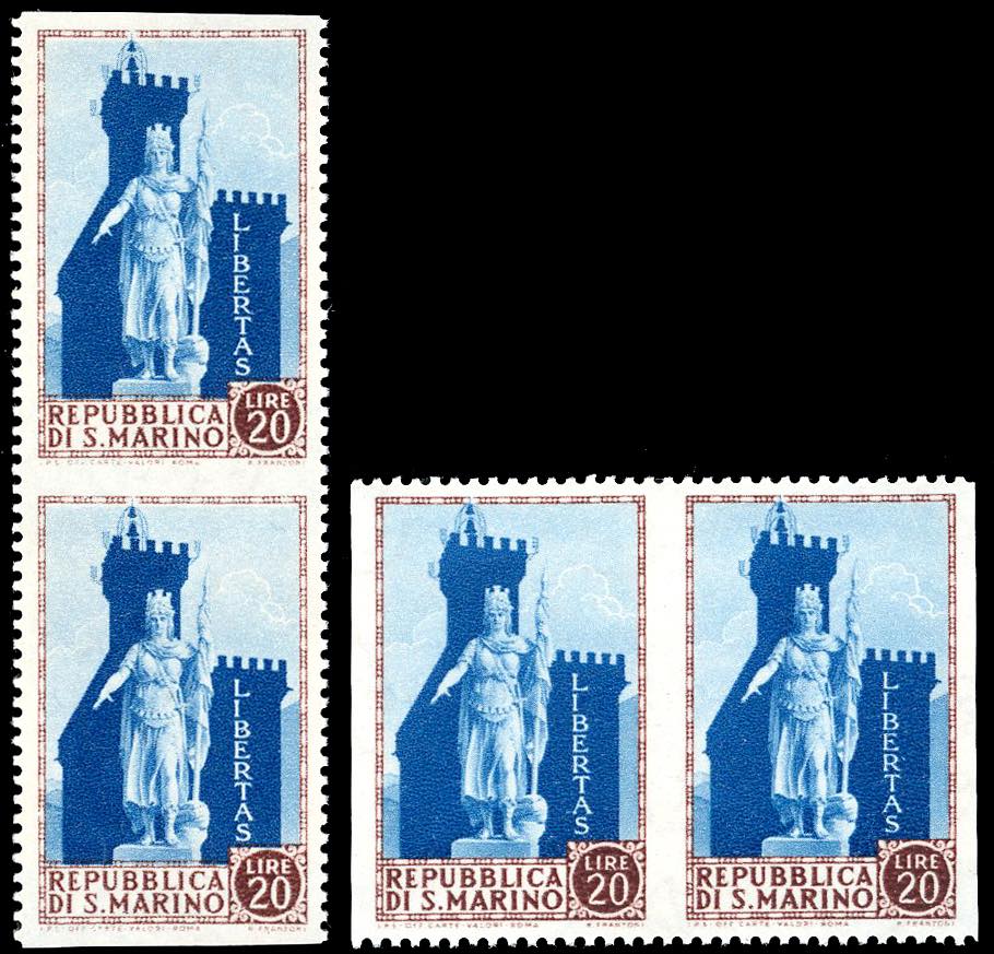 1954 - 20 lire Libertà, coppia verticale non dentellata orizzontalmente e coppia orizzontale non dentellata verticalmente (420b,420c), nuove, gomma originale integra, perfette. Ferrario.