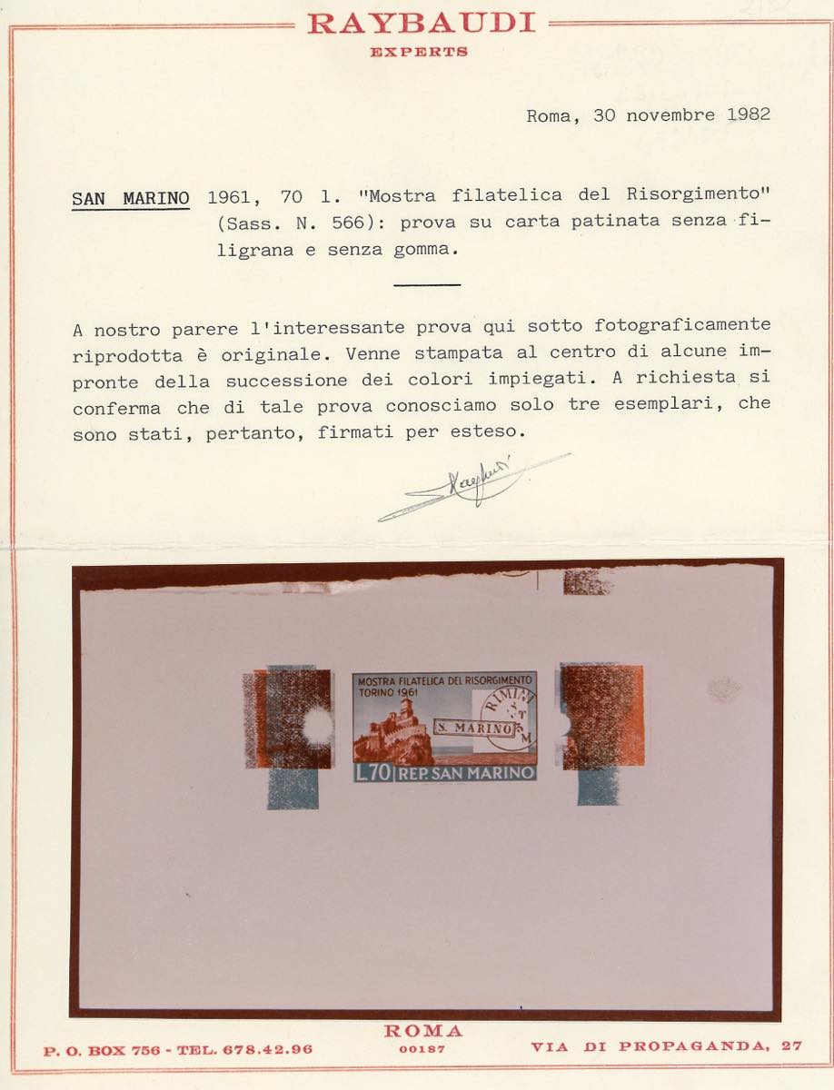 1961 - 70 lire Mostra filatelica del Risorgimento (566), prova su carta patinata, cm 16,5x10, senza gomma, perfetta. Molto rara, TRE SOLI ESEMPLARI NOTI! Cert. Raybaudi.