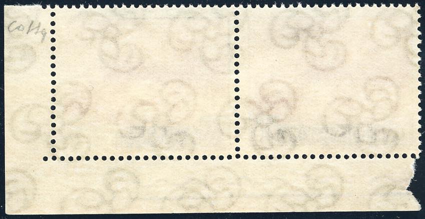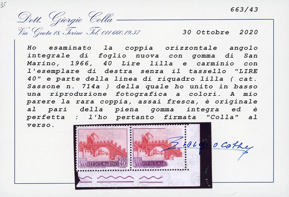 1966 - 40 lire Vedute, coppia orizzontala, il secondo esemplare con stampa parziale del lilla, senza il tassello "Lire 40" (714a), angolo di foglio, gomma originale integra, perfetta. Splendida e rara. Cert. Colla.