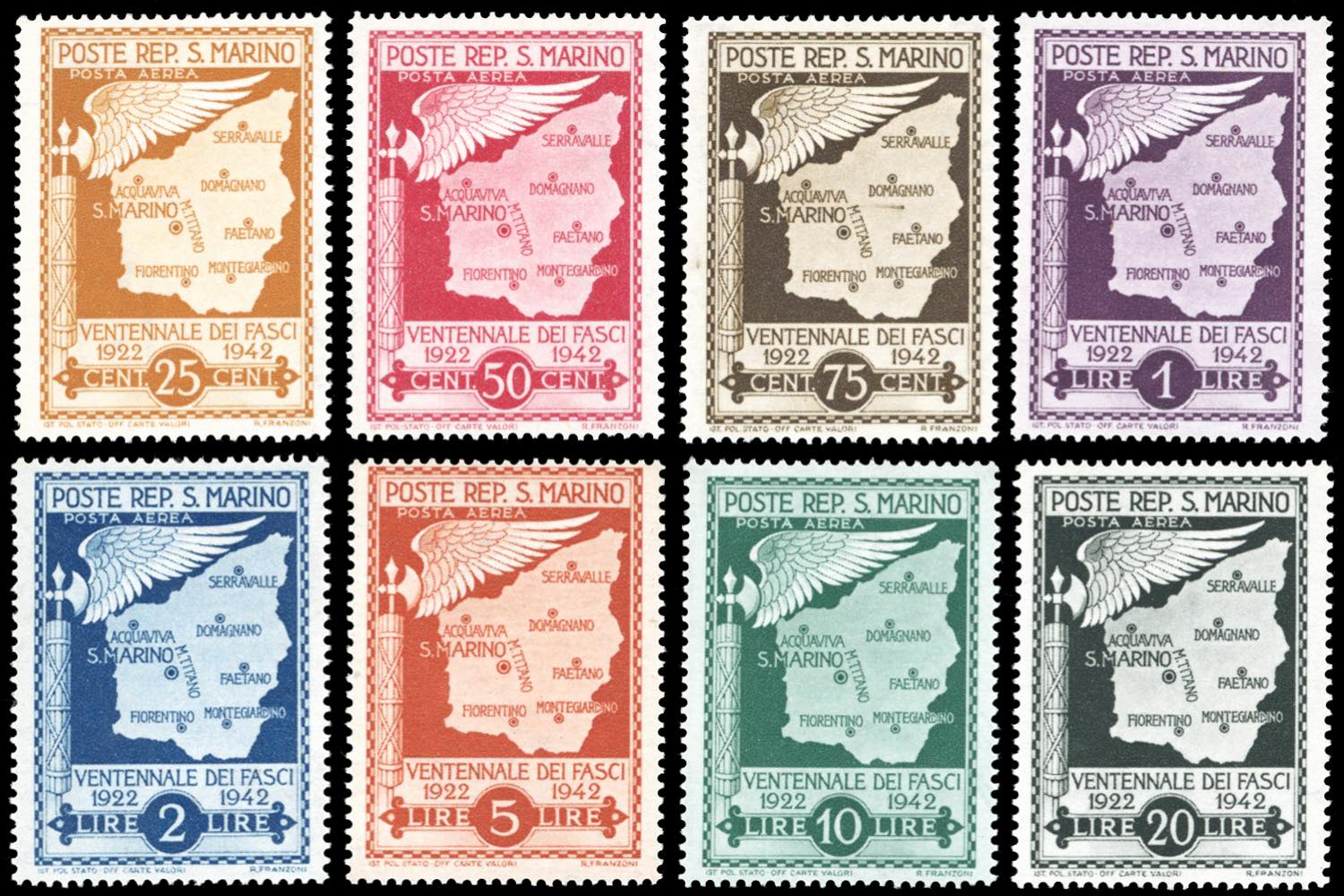 1943 - Ventennale dei Fasci, non emessi, serie completa (26/33), gomma originale , perfetti e molto freschi. Cert. E.Diena e Ferrario.