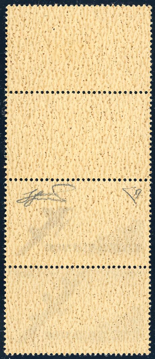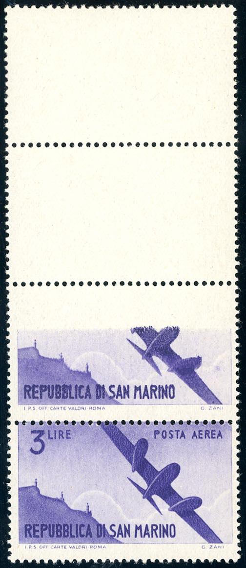 1946 - 3 lire Vedute, striscia verticale di quattro, i primi due esemplari con stampa totalmente mancante, il terzo con stampa incompleta ... Leggi tutto
