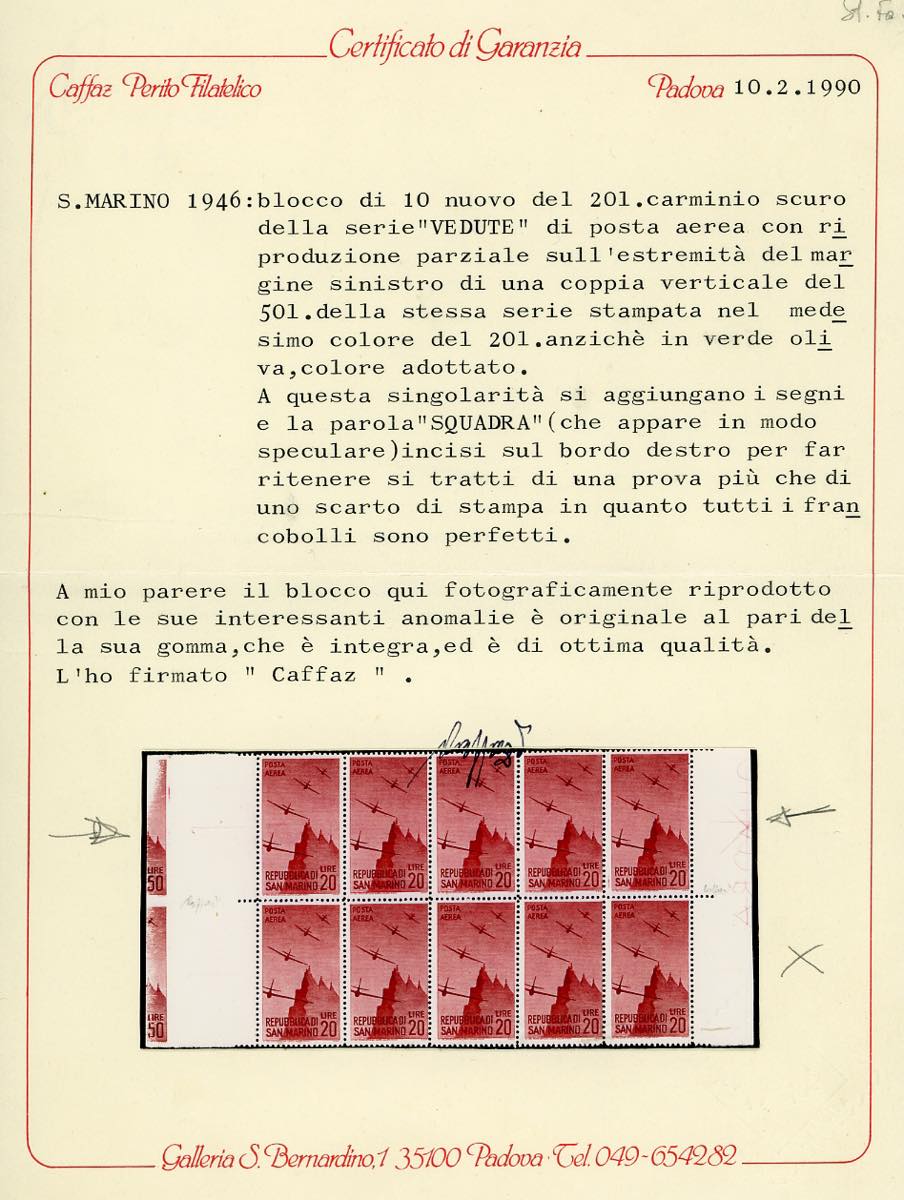1946 - 20 lire Vedute, striscia orizzontale di cinque con unito l'interspazio di gruppo laterale sinistro e parte del francobollo adiacente con il valore "lire 50" stampato in carminio scuro anziché in verde oliva, gomma originale integra, perfetta. Molto rara. Cert. Caffaz del blocco di provenienza.