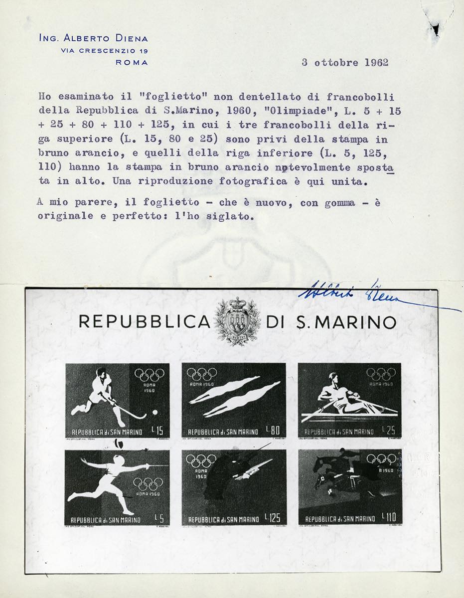 1960 - Olimpiadi di Roma, foglietto, stampa del bruno mancante negli esemplari superiori e fortemente spostata in alto in quelli inferiori (21 c/d), gomma integra, perfetto. Rarissimo e di ottima qualità. Cert. A.Diena.