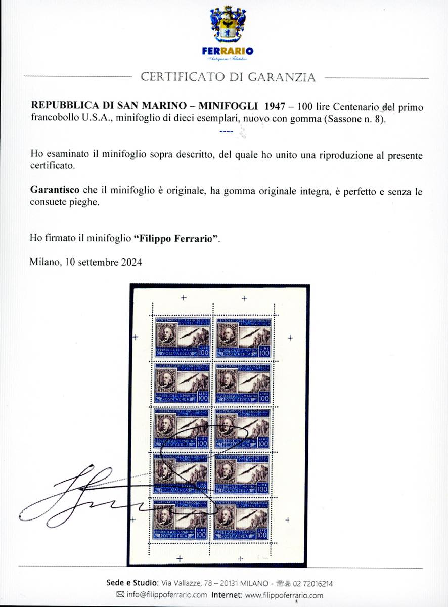 1947 - 100 lire Centenario francobollo americano, minifoglio (8), senza pieghe, gomma originale integra, perfetto. Molto bello. E.Diena, cert. Ferrario.