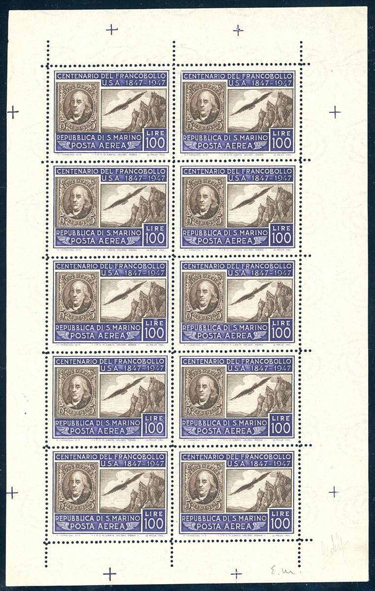 1947 - 100 lire Centenario francobollo americano, minifoglio (8), senza pieghe, gomma originale integra, perfetto. Molto bello. E.Diena, ... Leggi tutto