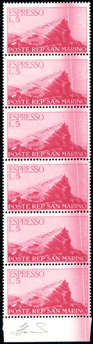 1945 - 5 lire rosa Veduta (13), striscia verticale di sei con evidente taglio chirurgico che interessa tutti gli esemplari, bordo di foglio, gomma originale integra, perfetta. Bella. Ferrario.