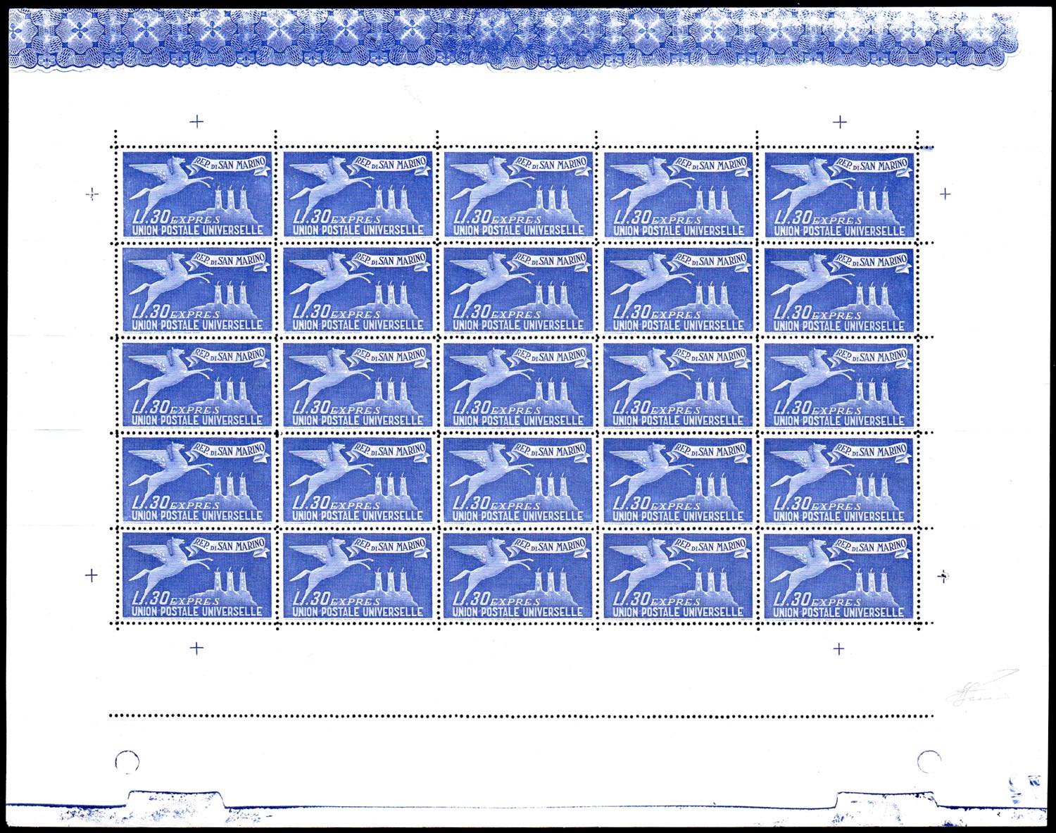 1946 - 30 lire (15), foglio completo di 25 esemplari, dentellatura orizzontale ripetuta sul bordo, non catalogata, gomma originale integra, perfetto. Rarissimo e non catalogato.