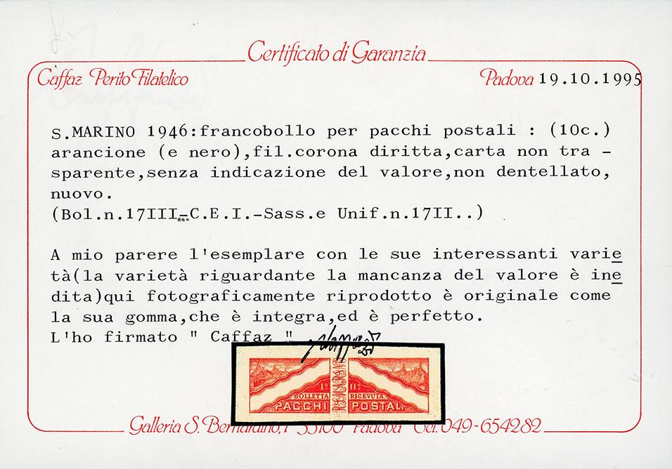 1946 - 10 cent. carta non trasparente, filigrana corona dritta, senza le diciture del valore in entrambe le sezioni (17/IIa), non dentellato, gomma originale integra, perfetto. Varietà molto rara, non catalogato non dentellato. Cert. Caffaz.