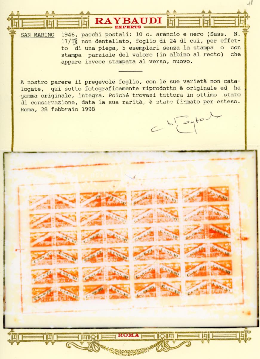 1946 - 10 cent., carta bianca, filigrana corona dritta, blocco di sei esemplari, due esemplari completamente senza la stampa del valore, tre esemplari con la stampa parziale, la parte mancante è impressa al verso (17/IIba), angolo di foglio, gomma originale integra, perfetto. INSIEME UNICO! G.Bolaffi, cert. Avanzo e Oro Raybaudi.