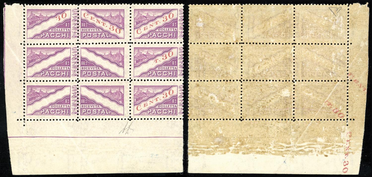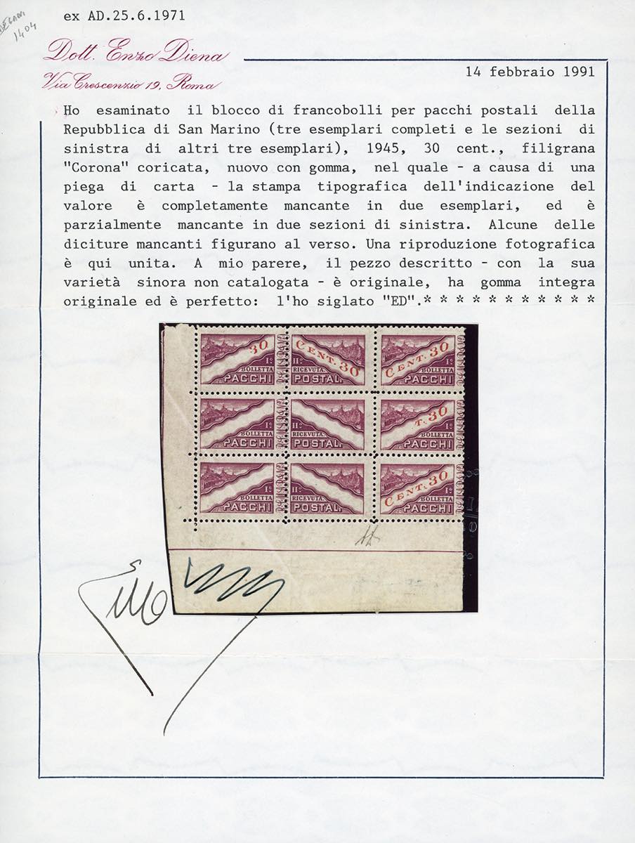 1945 - 30 cent, filigrana corona coricata (20), striscia verticale di tre con unite le sezioni di sinistra degli esemplari a fianco, stampa tipografica del valore completamente mancante in due esemplari e parzialmente mancante nel primo, angolo di foglio, gomma originale integra, perfetto. Bella e rarissima varietà causata dall'anomala piegatura del foglio in fase di stampa, non catalogata per questo valore. Insieme PROBABILMENTE UNICO! A.Diena, cert. E.Diena.