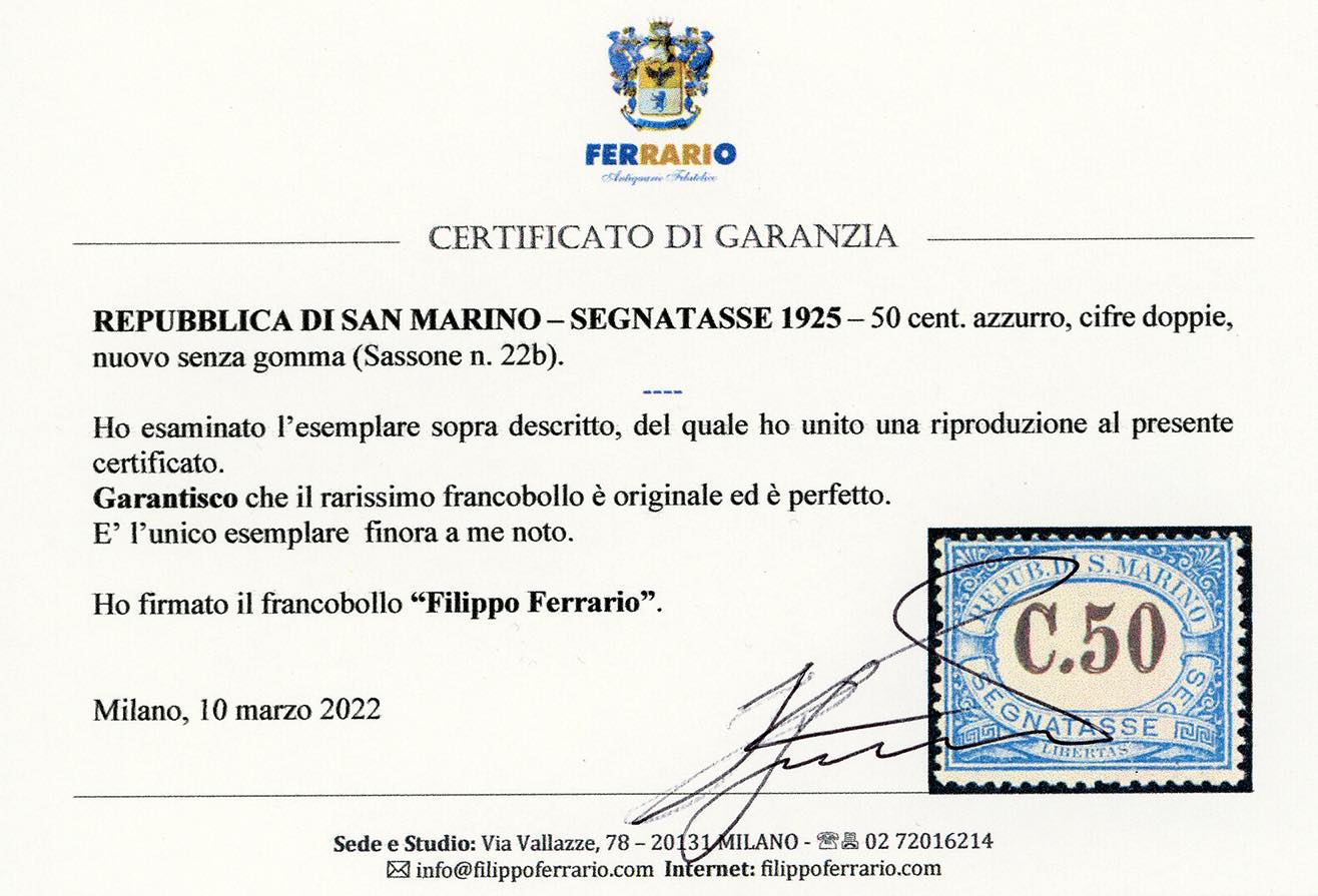 1925 - 50 cent. azzurro, cifre doppie (22b), nuovo senza gomma, perfetto. UNICO ESEMPLARE NOTO, citato dal cat. Sassone. Cert. Ferrario.