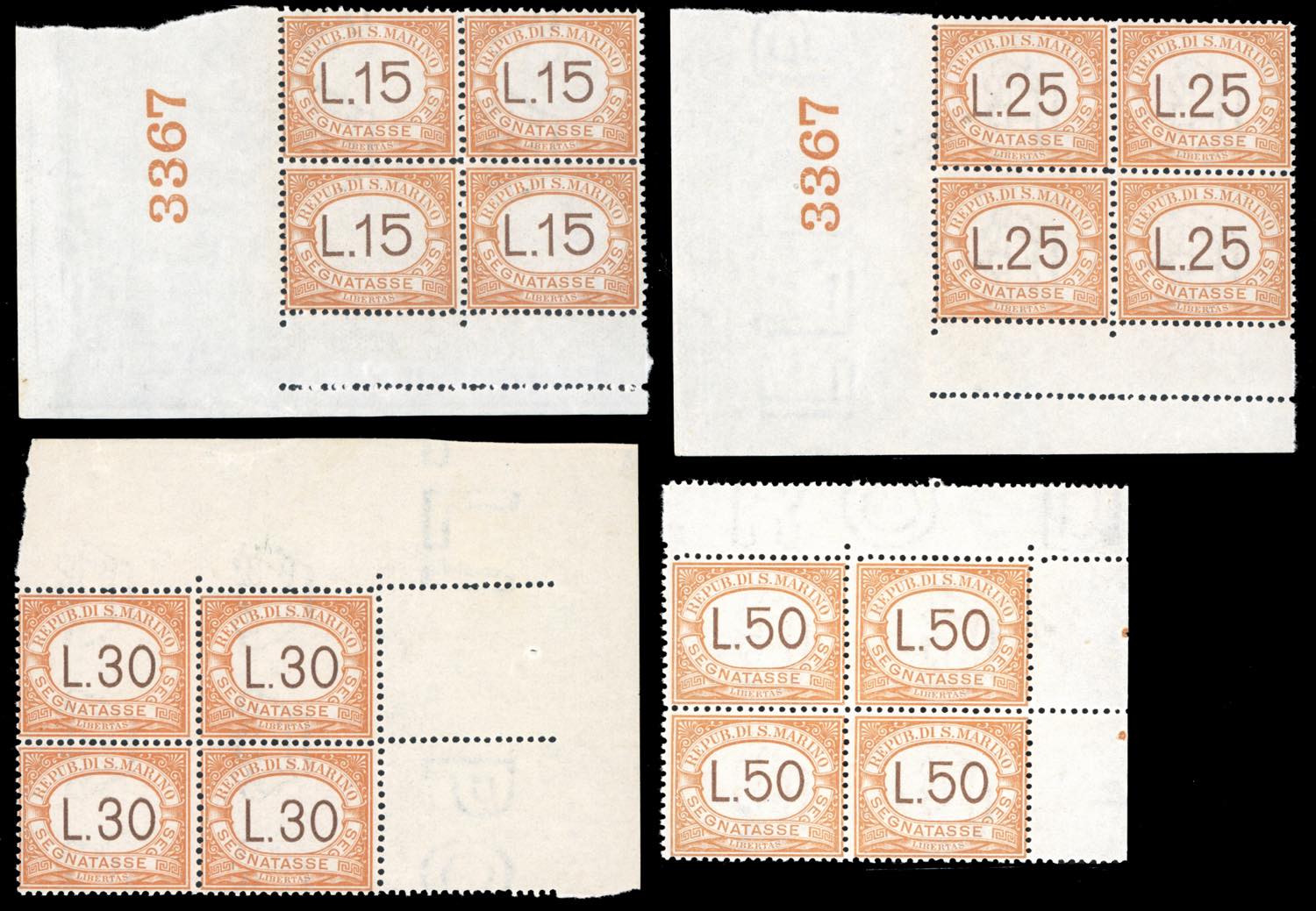 1927/28 - Serie completa (28/31), blocchi di quattro, angolo di foglio, due con numero di tavola, gomma originale integra, perfetti. ... Leggi tutto