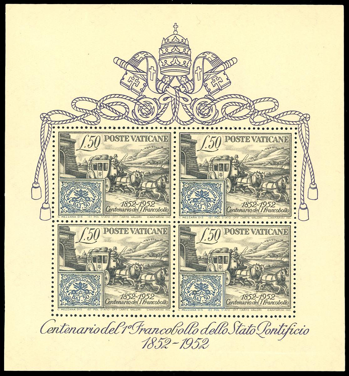1952 - 50 lire Centenario francobolli Stato Pontificio, foglietto (1), nuovo, gomma originale integra, perfetto. Ferrario.