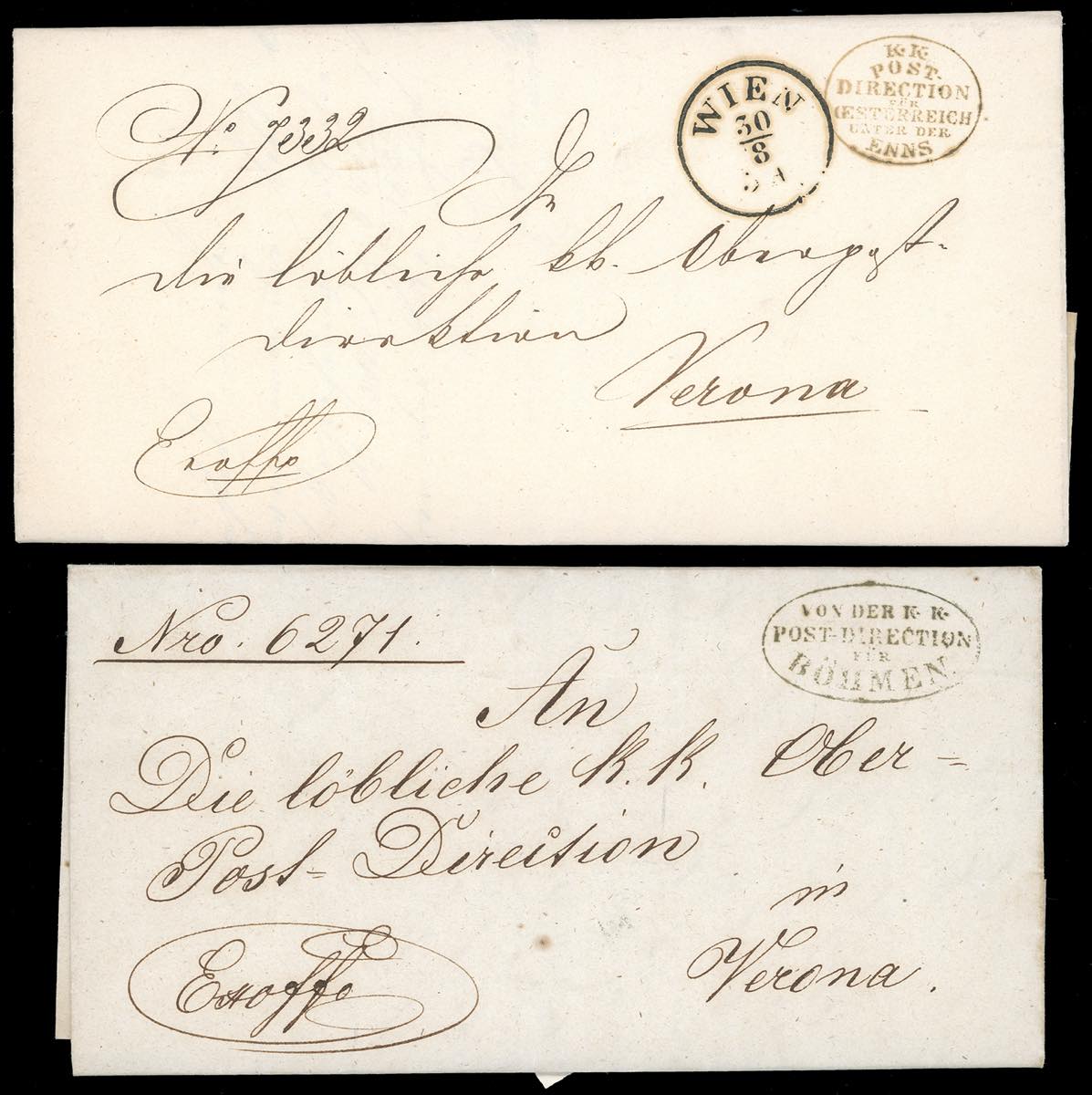 AUSTRIA 1850/57 - Due lettere in franchigia dalla Direzione delle Poste di Bohmen e di Vienna a Verona, entrambe con l'indicazione manoscritta della staffetta sul fronte. Non comuni!